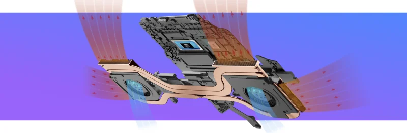 Le système de refroidissement intègre deux ventilateurs équipés de 94 pales ultra-fines, conçus pour déplacer l’air de manière plus fluide et plus silencieuse. L’air circule à travers quatre caloducs en cuivre, ce qui aide à dissiper la chaleur rapidement et à maintenir des performances optimales même lors des tâches exigeantes.